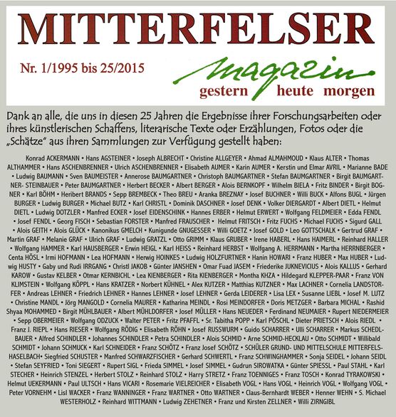 [[Datei:Mitterfelser Magazin Autoren und weitere Mitarbeiter.jpg|zentriert|mini|586x586px|Inzwischen haben über 200 Autoren, Fotografen, Grafiker und Helfer im Organisationsteam am Mitterfelser Magazin unentgeltlich mitgewirkt. – Grafik: Franz Tosch]] | [[Datei:Mitterfelser Magazin Autoren und weitere Mitarbeiter.jpg|zentriert|mini|586x586px|Inzwischen haben über 200 Autoren, Fotografen, Grafiker und Helfer im Organisationsteam am Mitterfelser Magazin unentgeltlich mitgewirkt. – Grafik: Franz Tosch]] | ||