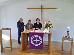 [[Datei:Ev Kirche 02 Gottesdienst.jpg|mini|Altarraum der evangelischen Heilig-Geist-Kirche Mitterfels mit Pfarrerin Susanne Kim und den Mesnern Uwe Teiwes und Doris Metzger - Foto: Doris Metzger]] | |||