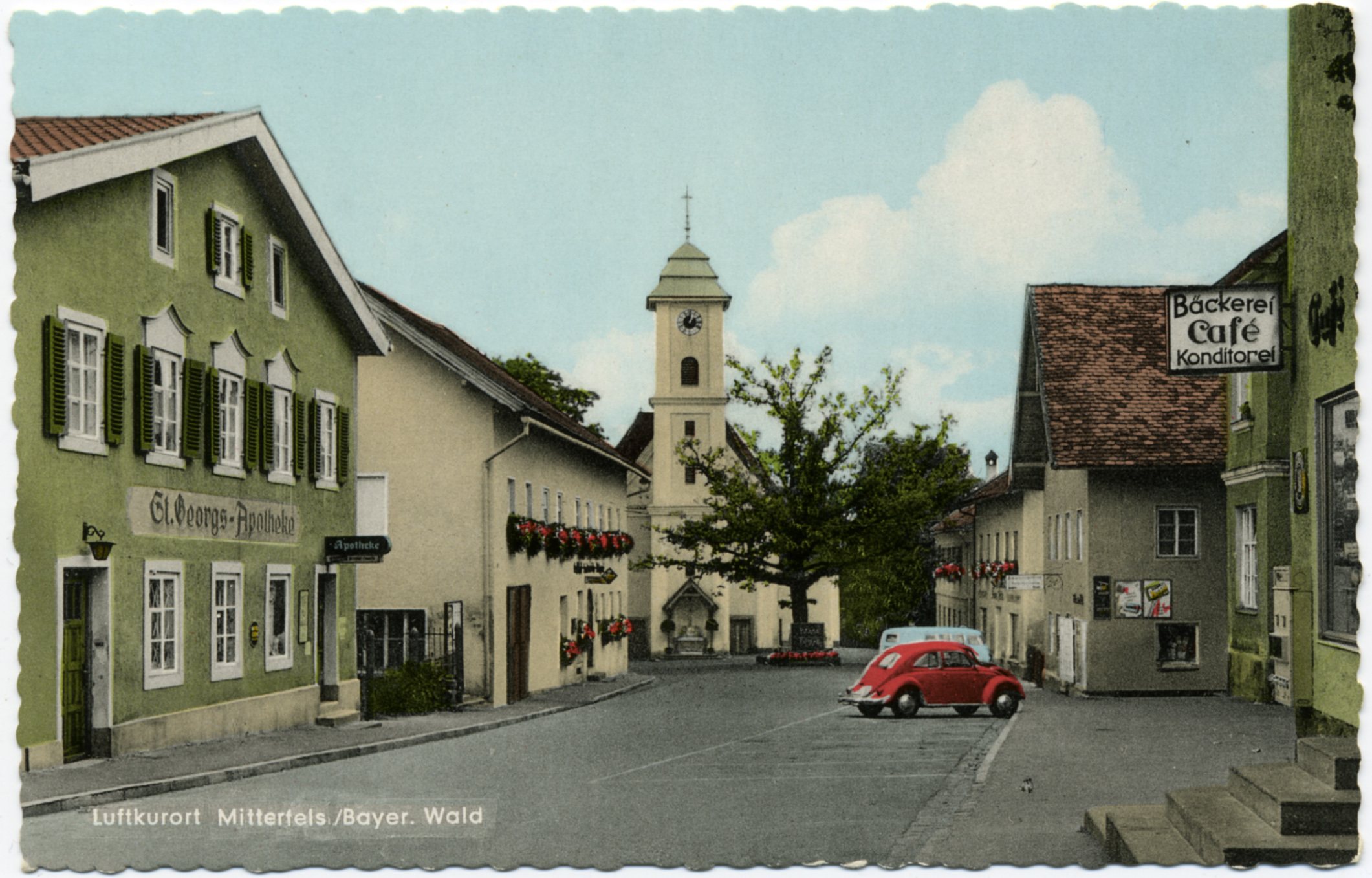 Die „alte“ St. Georgs-Apotheke in der unteren Burgstraße - Postkarte um 1965; Aufn. und Verlag Foto-Eiglsperger, Mitterfels; Sammlung Otmar Kernbichl