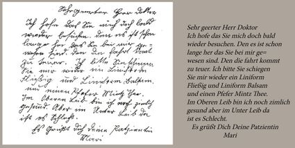 Mehr an schwungvolle „Doktorschrift“ gewohnt, erfordern Zettelchen wie dieses doch einiges Nachdenken. Der Leser mag sich fragen, warum das alte Mutterl seine Trinkmilch ausgerechnet in der Apotheke suchte.