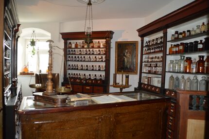 Da ist das gutmütige greisenhafte Haupt des Apothekers mit den wissenden, klaren Augen, der nach Begehr und Wunsch fragt. Es sind alte Leute, meist aus der umliegenden Gegend, die in ihren ländlichen sonntäglichen Anzügen zu Fuß, mit dem Fahrrad oder gar auf dem Gäuwagerl hereinpilgerten. Jeder von ihnen hat seine Sonderanliegen, zum Teil auf Wunschzetteln geschrieben, manchmal recht umständlich und zaghaft hervorgestottert, manchmal auch recht resolut vorgetragen: „Tabletten möcht i.“ „Darf ich fragen, was für Tabletten Sie meinen?“ „Ja, zum Einnehmen. Weiße warn‘s, in einem blauen Schachterl drin.“ „Nein, ich meine für welche Krankheiten.“ „Für alles! - Wenn ich‘s seh, nacha woaß ich‘s scho.“ Alsdann lässt man ihm halt die Freud, zeigt ihm die vielen Schubladen und bittet ihn, sich alles nur gut anzuschau‘n. Zögernd geht er um den Handverkaufstisch herum, und nach kurzem Überlegen zieht er eine Schublade heraus. Doch welche Vielfalt von Farben und Schachteln! Und mit einem „I sichs scho, Ihr habt‘s es nöt“, gibt er allzu schnell auf. Der Apotheker, mit Umgang und Ausdruck vertraut und wohl wissend, was er meint, öffnet ihm die Schublade mit den vielerlei Schmerztabletten. Da hellt sich sein Gesicht auf und er greift nach einer Packung: „Ja, da habt‘s ös ja doch!“