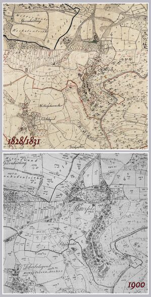 Der Vergleich der Uraufnahmeblätter Mitterfels (aus den Jahren 1828/1831) mit der nachfolgenden Karte um das Jahr 1900 zeigt, dass die Entwicklung von Mitterfels auch im 19. Jahrhundert (und bis weit in das 20. Jahrhundert hinein) nur sehr langsam erfolgte. Nur im Bereich der (heutigen) Lindenstraße und Straubinger Straße sind (in der Karte von 1900 zu sehen) einige Häuser dazugekommen.