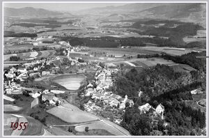 Ab den 1960er-Jahren wuchs Mitterfels erstmals stark in der Fläche. Die Erschließung von Baugebieten hatte Fahrt aufgenommen. Die Postkarte von 1955 zeigt bereits die allmähliche Verlagerung der baulichen und geschäftlichen Entwicklung zur Straubinger Straße und Bayerwaldstraße.