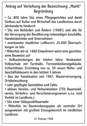 Die Entscheidung in München fiel überraschend schnell. Am 5. Juli 1968 stand sie im Staatsanzeiger: "Mit Entschließung des Bayerischen Staatsministeriums des Innern von heute wurde der Gemeinde Mitterfels die Bezeichnung "Markt" verliehen. Gez. Dr. Merk, Staatsminister."
